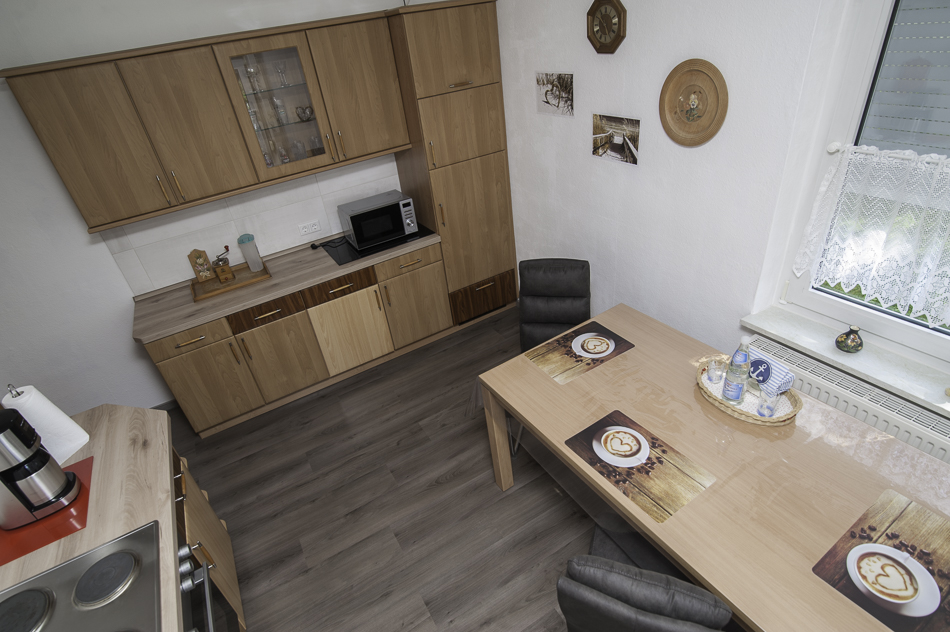 Küche: 15 qm mit E-Herd, Backofen, Mikrowelle, Kaffeemaschine, Wasserkocher, Kühlschrank und Gefrierschrank sowie Spülmaschine