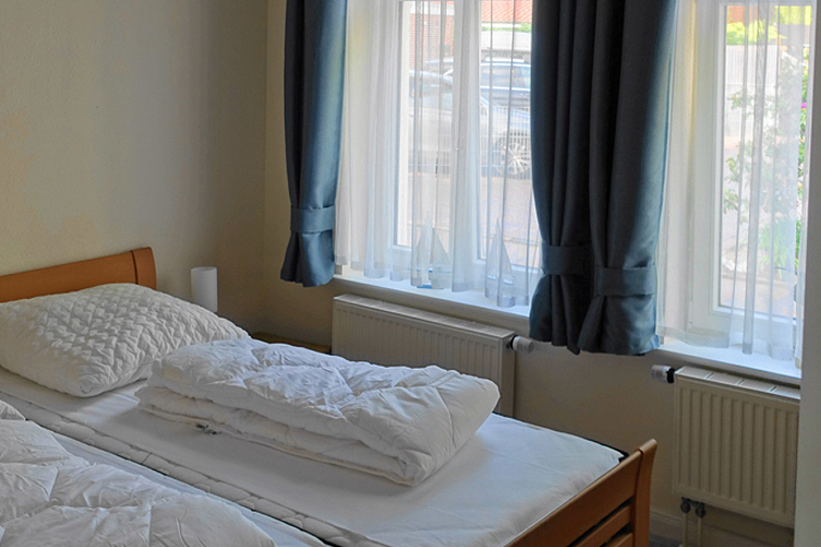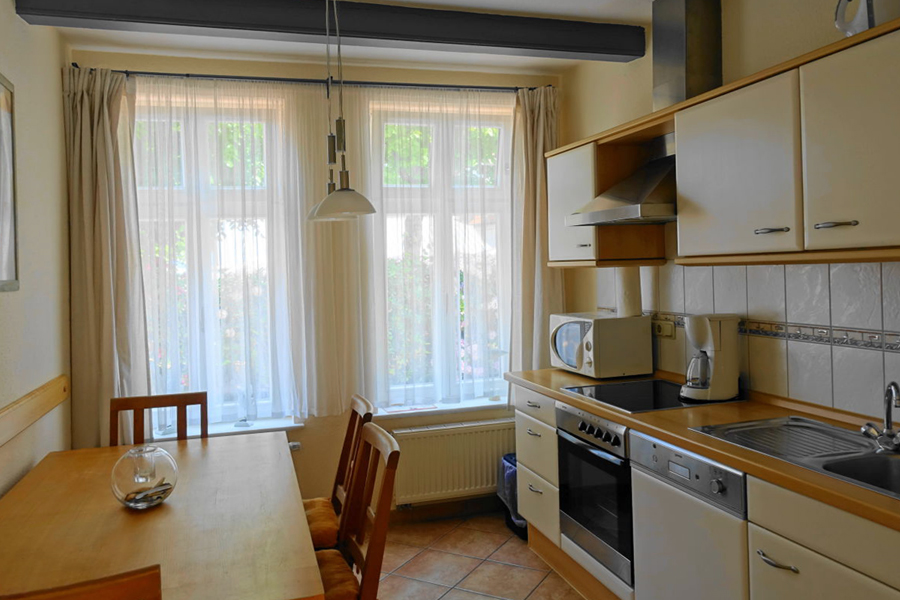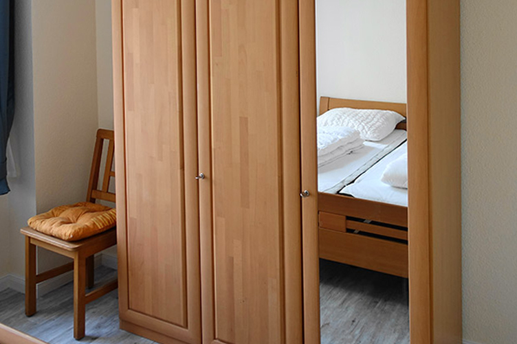 Die Wohnung verfügt über zwei Schlafräume, Wohnraum, Küche, Bad und separates WC. Sie hat einen separaten Eingang. Eine Gemeinschaftsterrasse steht allen Bewohnern zur Verfügung. Fahrzeuge können auf unseren hauseigenen Parkplätzen abgestellt werden.
