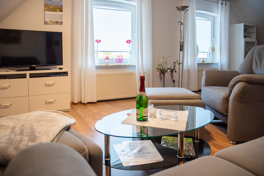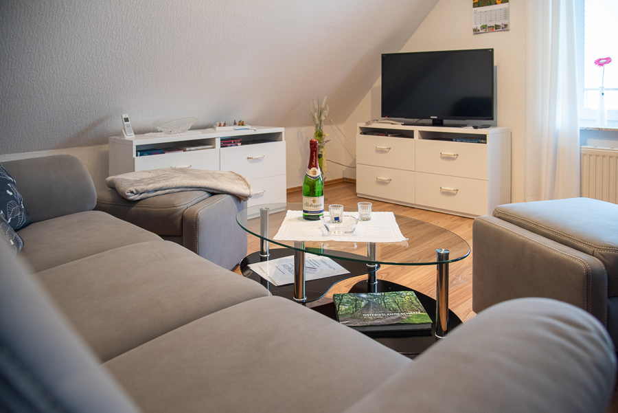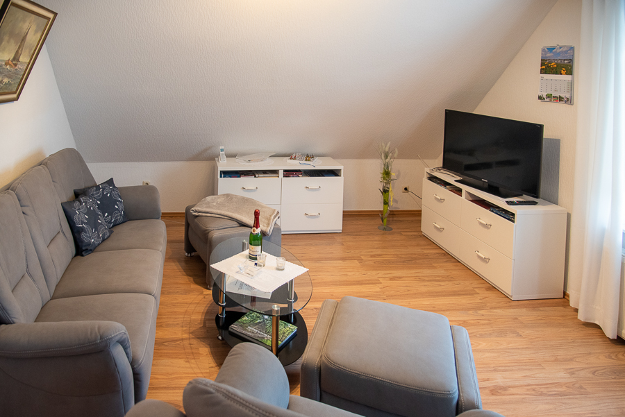 Die Wohnung hat einen separaten Eingang und besteht aus einem großen Wohnzimmer mit Essecke und Küchenzeile, 2 Schlafzimmern ( 2 x Doppelbett), Bad mit Dusche u. WC sowie einer großen Loggia. In einem Schlafzimmer befindet sich zusätzlich ein Waschbecken. Besonders lädt die große, helle Loggia mit Fenster in Richtung Westen zum Verweilen ein. Von hier aus haben Sie einen freien Blick über die greetsieler Sportanlagen auf den Deich.