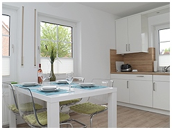 Die Ferienwohnung "Südwind" befindet sich im EG des "Greetsieler Inselhuus" nur einige Meter vom Deich entfernt. Die moderne, anspruchsvoll eingerichtete Wohnung (75 qm) ist für bis zu 4 Pers. ausgestattet. Sie besteht aus zwei Schlafzimmern, eines mit Doppel-, das andere mit Etagenbett, einer Küche, einem Wohn-/Essbereich und einem Duschbad.