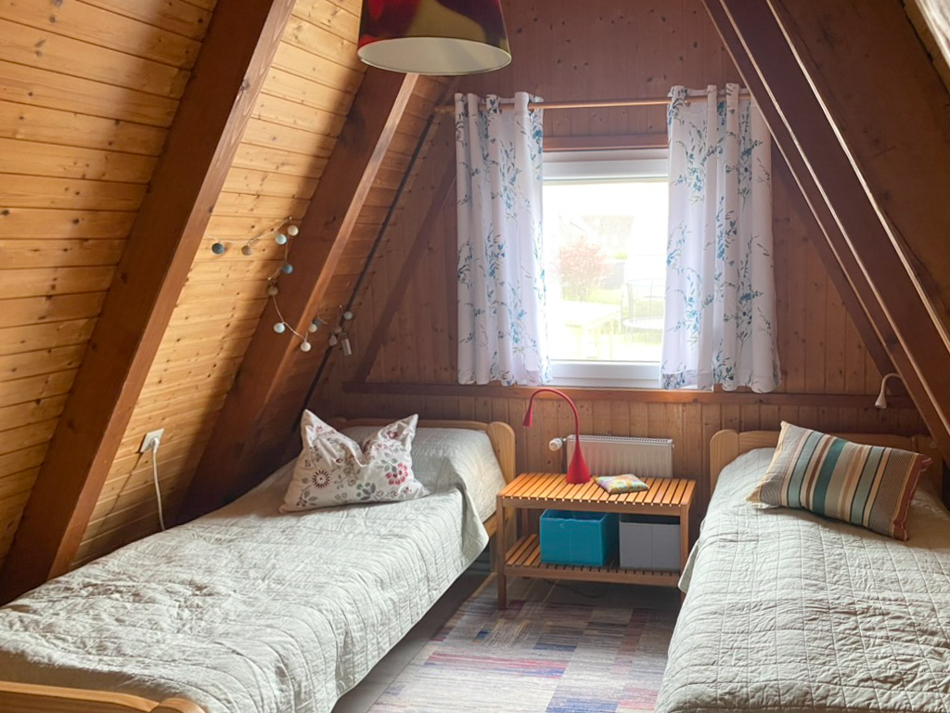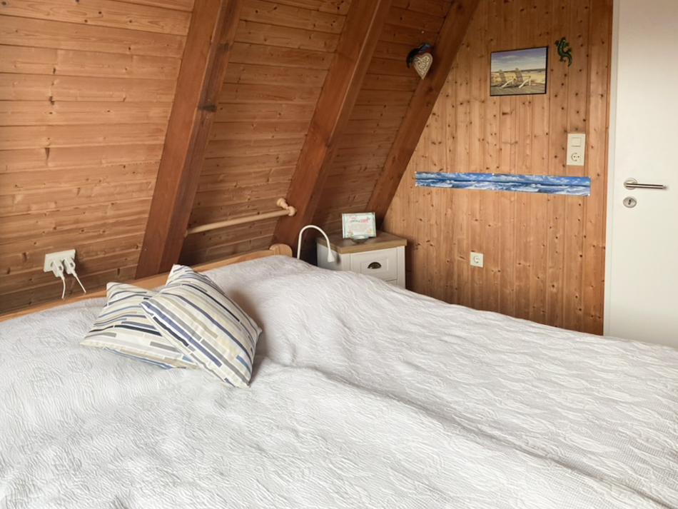 Eine Vollstufentreppe führt zum Obergeschoß mit zwei getrennten Schlafzimmer, eingerichtet mit einem Doppelbett und 2 Einzelbetten. Ein Ganzkörperspiegel, sowie ein großer Kleiderschrank befinden sich ebenfalls im OG.