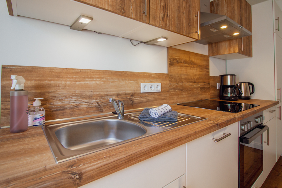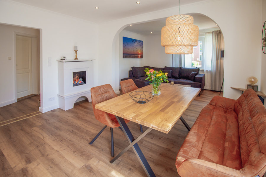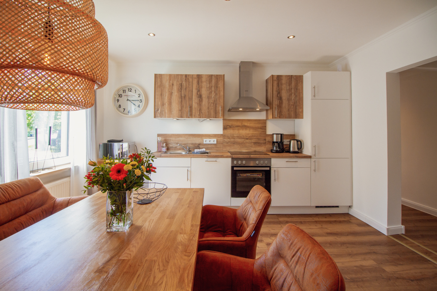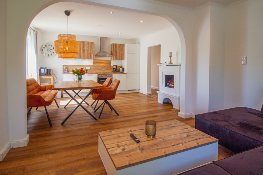 Die Ferienwohnung Sonne hat einen schönen offenen Wohnraum mit vollausgestatteter Küche und einer gemütlichen Sofaecke mit großem Smart TV und Kamin. Das Schlafzimmer hat ein großes Boxspring Doppelbett (180 x 200 cm) und bietet viel Komfort.