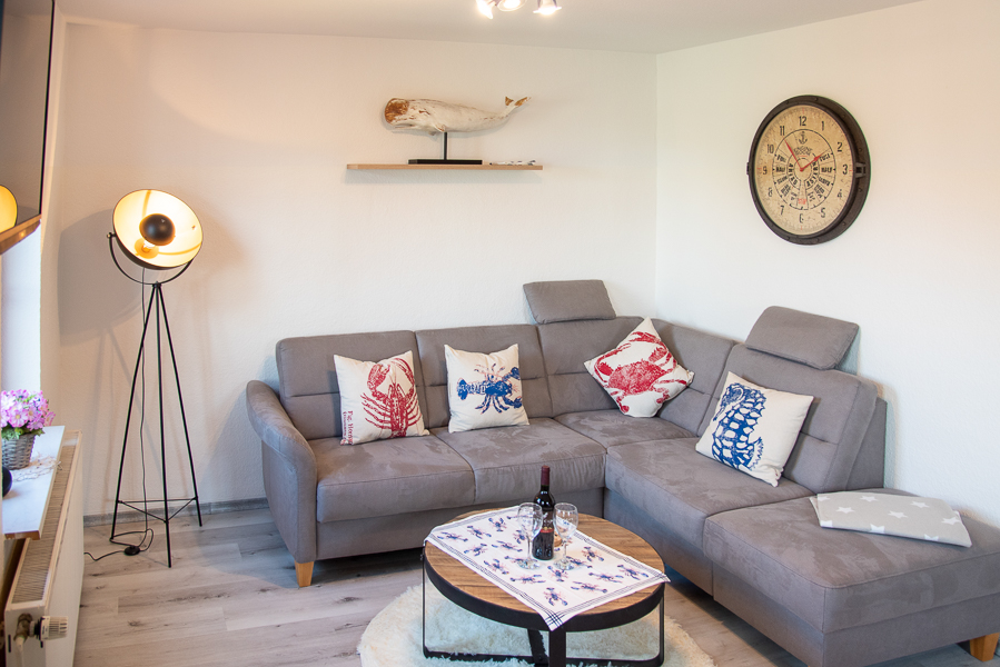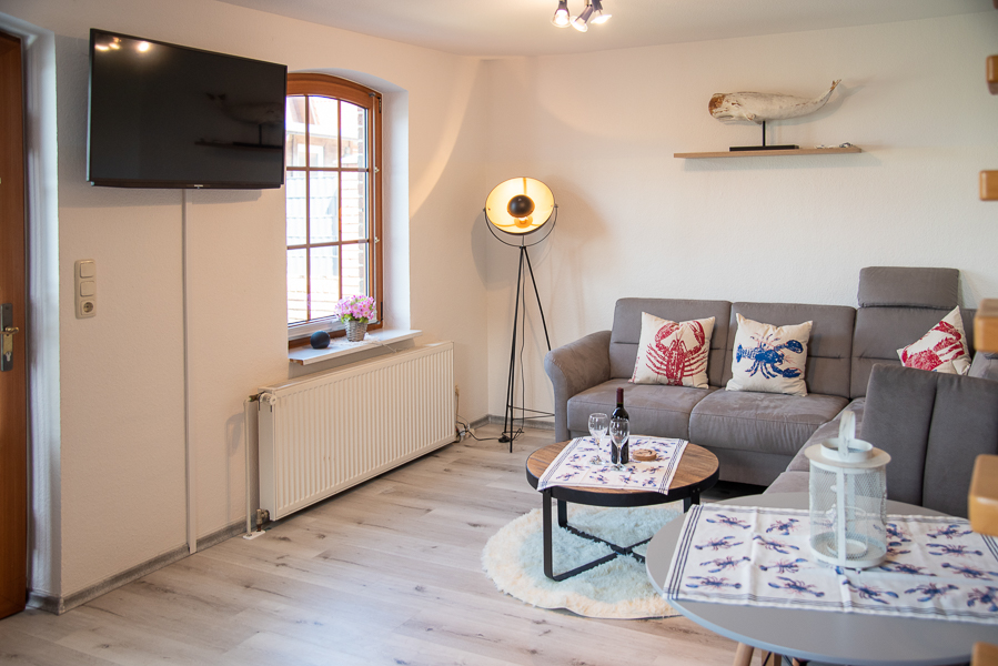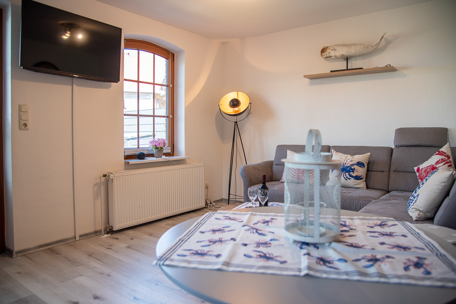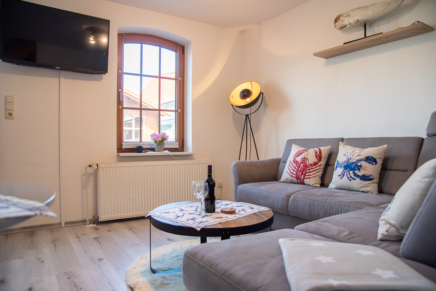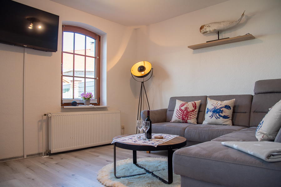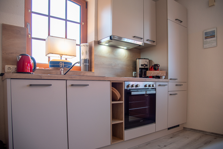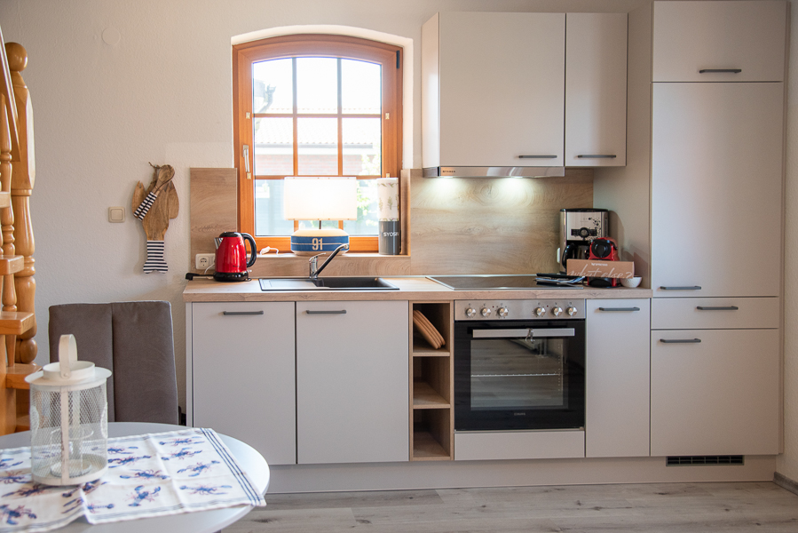Im Erdgeschoss befindet sich der Wohnbereich mit Küchenzeile und Essbereich, im Obergeschoss sind ein Badezimmer und zwei Schlafzimmer eingerichtet.