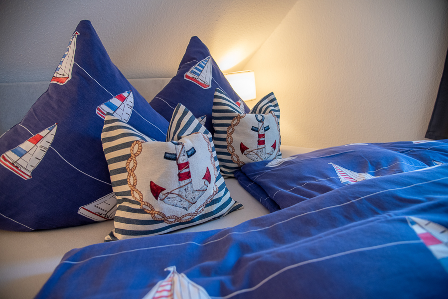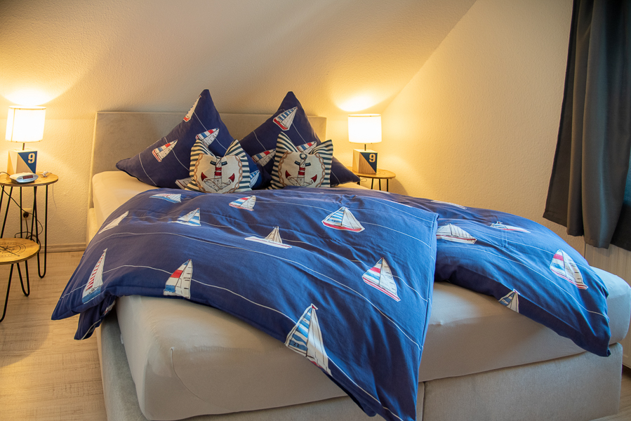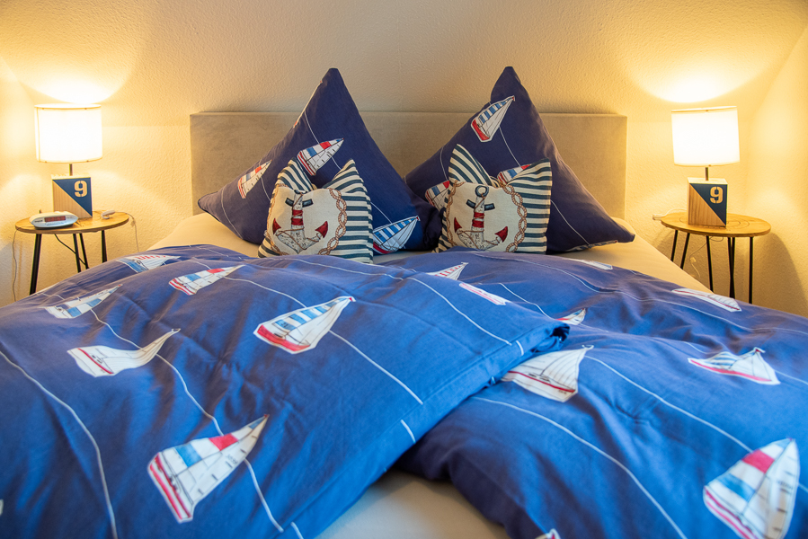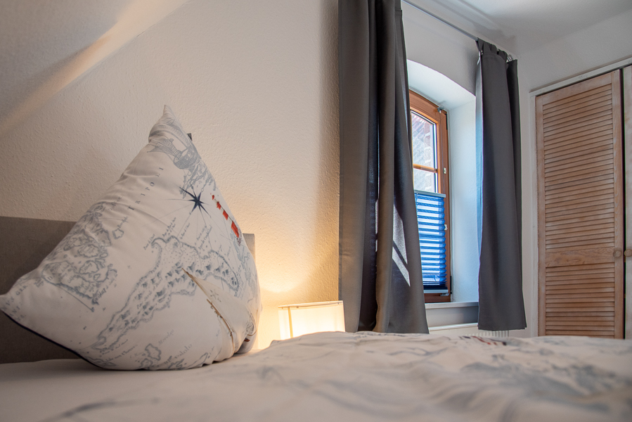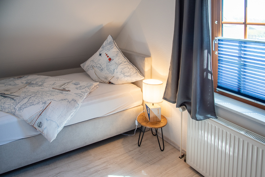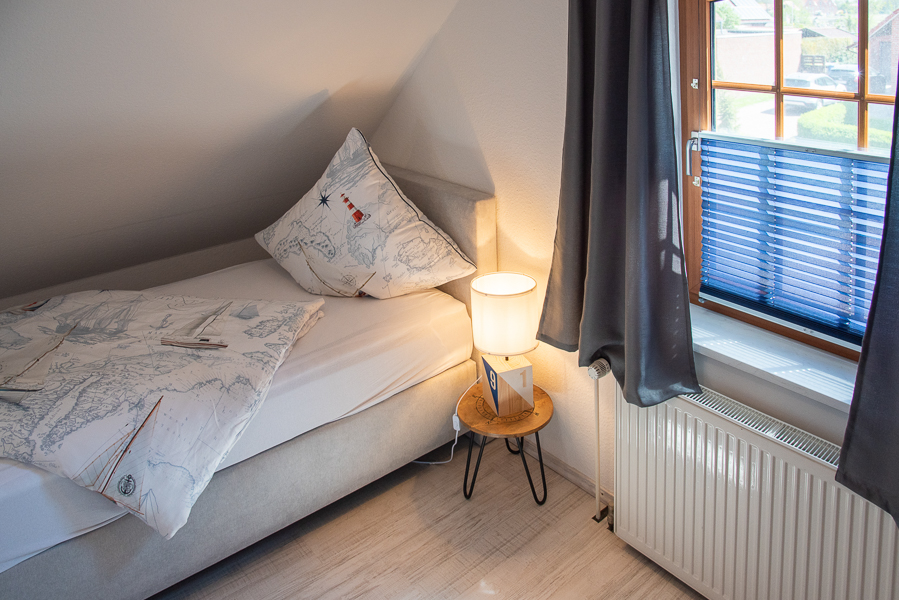 Das Schlafzimmer auf der Ostseite ist kinderfreundlich mit einem Einzelbett und einem Kinder(-gitterbett) möbliert. Im Schlafzimmer auf der Westseite steht ein Doppelbett (Himmelbett).