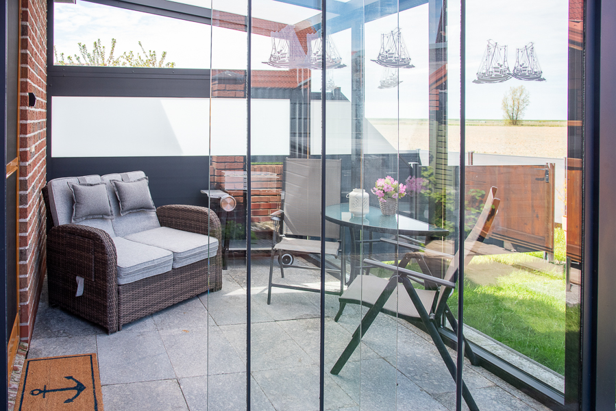Zur Westseite gehört ein kleiner Garten mit Gartenhäuschen zum Haus. Gartenmöbel und Grill sind Teil der Ausstattung.