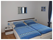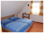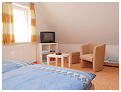 1. Schlafzimmer 1. Etage: Das Schlafzimmer ist mit Teppichboden ausgelegt und verfügt über ein großes Doppelbett nebst Konsolen. Für reichlich Stauraum sorgen Kleiderschrank, Wäschekommode und Regal. Eine kleine Sitzecke mit Farb-TV bietet Ihnen eine zusätzliche Möglichkeit zur Erholung.