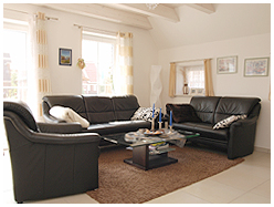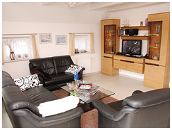 Das große Wohnzimmer ist mit einer Ledersitzgarnitur, modernem Wohnzimmerschrank mit integrierter Beleuchtung sowie Farb-TV mit SAT-Anlage und DVD eingerichtet. Hi-Fi-Anlage mit CD und ein WLAN-Anschluss sowie Telefon sind ebenso vorhanden. Elektrische Außenrollos und Fliegengitter komplettieren die Ausstattung.