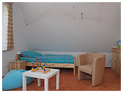 2. Schlafzimmer 1. Etage: Das zweite Schlafzimmer ist ebenfalls mit Teppichboden ausgelegt, verfügt aber über 2 große Einzelbetten (je 2 x 1 m) und Nachtkonsolen. Auch hier sind Kleiderschrank und Wäschekommode vorhanden. Zusätzlich befinden sich ein Holzgitterbett und Spielzeug sowie Kinderbücher im Raum.