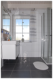 Bad 1. Etage: Auch dieses Bad verfügt über Dusche, WC, Waschbecken mit Unterschrank, Fußbodenheizung und Handtuchwärmer. Ein beleuchteter Spiegel und der Fön komplettieren den Raum.