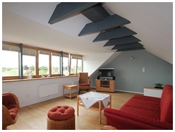 hat eine Wohnfläche von 90 m² und besteht aus einem großen Wohnzimmer mit Kamin, einer Essecke und moderner Einbauküche, zwei Schlafzimmern mit TV und zwei Badezimmern (Dusche und Badewanne). Auch diese Wohnung liegt direkt am Deich und ist nur 2 Minuten vom Ortskern entfernt.