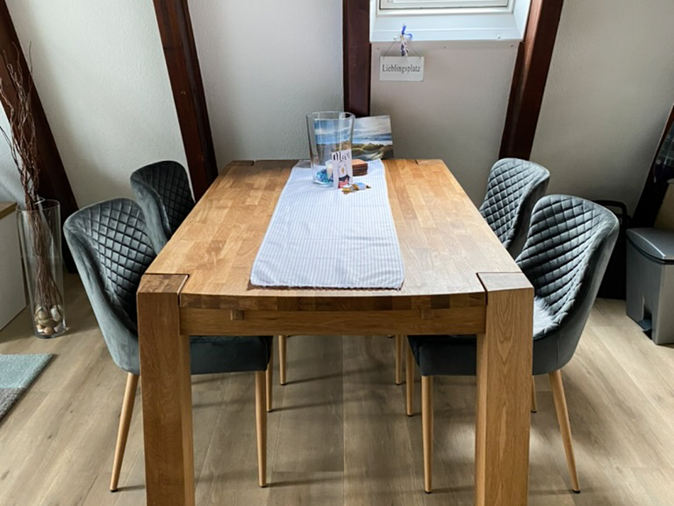 Eine großzügige Essecke mit angrenzendem Küchenbereich, der mit einem E-Herd mit Ceranfeld und Backofen, Kühlschrank mit Tiefkühlfach, Mikrowelle, Kaffee- und Espressomaschine, sowie einer Spülmaschine ausgestattet ist. Des weiteren gehören zur Küchenausstattung, Geschirr, Besteck und Gläser in ausreichender Menge.
