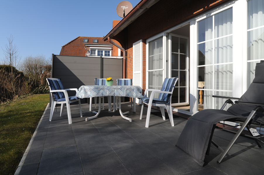 Eine große Terrasse befindet sich auf der Südseite, sie ist vom Wohnraum aus zu erreichen. Gartenmöbel stehen zur Verfügung. Die Rasenfläche vor der Terrasse kann genutzt werden.