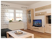Das großzügige Wohnzimmer mit Flachbild-TV, DVD-Player und Stereoanlage ist eingerichtet mit einer gemütlichen Couchgarnitur und einer modernen Wohnwand. Sie haben von hier aus Zugang zur sonnigen Süd-Terrasse.