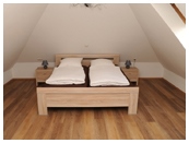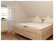 Die Wohnungen im Obergeschoß unseres Ferienhauses sind ca. 75 qm groß und bieten Platz für 2-4 Personen. Die Wohnung besteht aus zwei Schlafzimmern (eines davon im Dachgeschoss) mit Doppelbett, einem Wohn-/Essbereich und dem Duschbad. Kinderbett und Hochstuhl stehen zur Verfügung.
