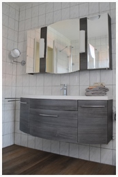 Im Bad mit Dusche und WC befindet sich neben einem großzügigen Waschtisch und einem Spiegelschrank ein Kosmetikspiegel und ein Fön.