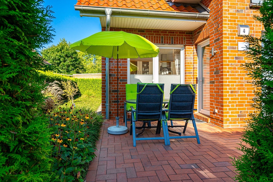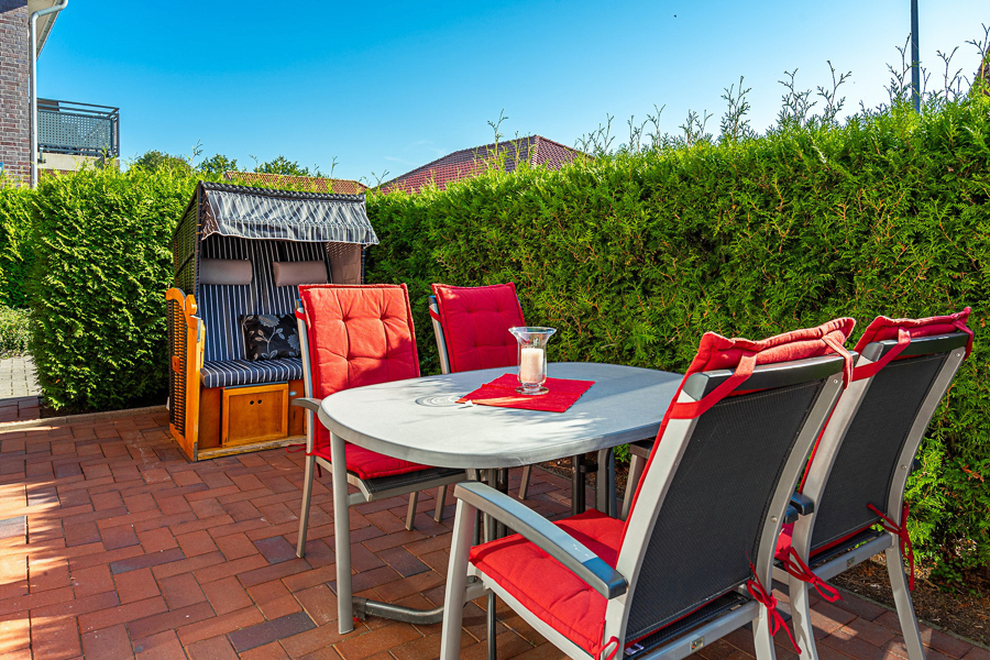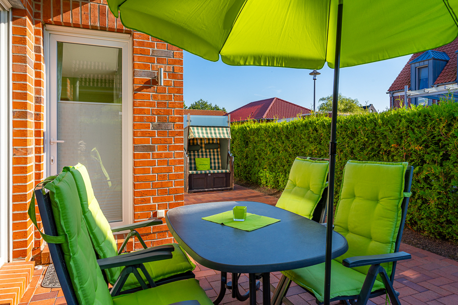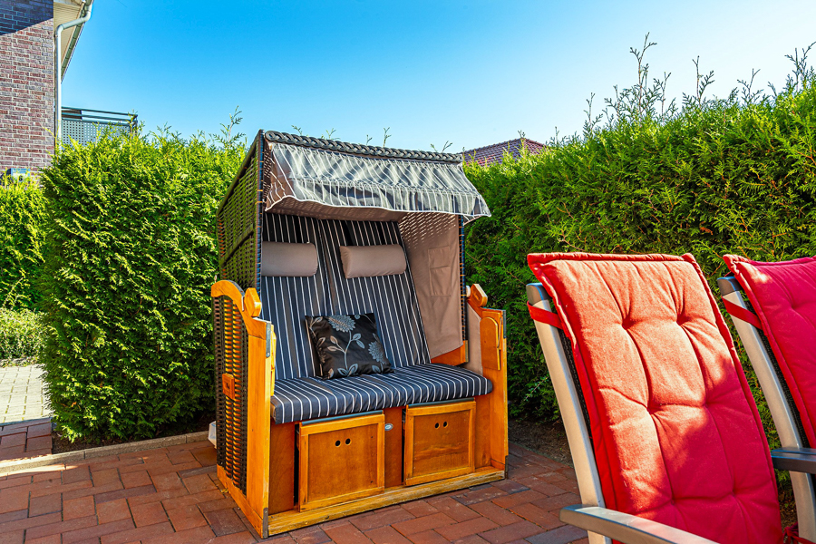 Die möblierte Terrasse mit Sonnenschirm und Strandkorb lädt zum Relaxen ein.