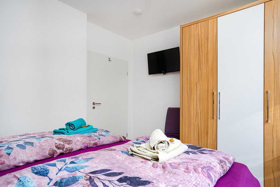 Im Schlafzimmer 2 finden Sie zwei Einzelbetten mit verstellbaren Lattenrosten vor, ein erholsamer Schlaf ist hier garantiert. Das Bad mit bodentiefer Dusche, Toto WC, einem Spiegelschrank, Handtuchheizkörper und Radio sorgen für einen optimalen Start in den Tag.