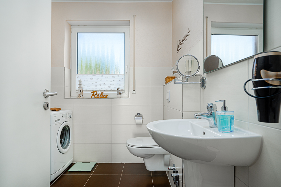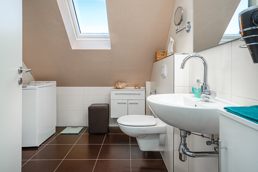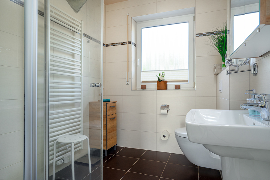 Das Tageslichtbad bietet neben einer ebenerdigen Dusche, Hänge WC und Waschbecken, einen Handtuchheizkörper, Bad Radio, Föhn und Kosmetikspiegel.