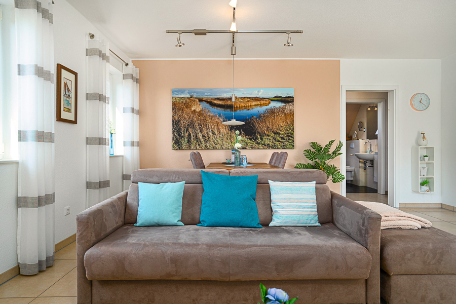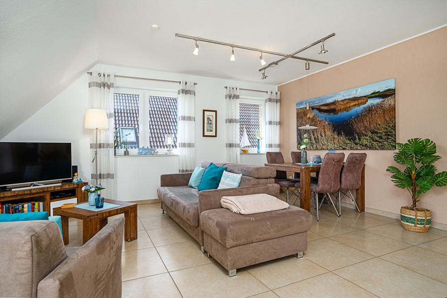Die Ferienwohnung bietet Perfektion auf 65 m² für 4 Personen. Ein offener, lichtdurchfluteter Wohn-/Essbereich mit Ecksofa und vollständig ausgestatteter integrierter Küche führt über eine große Fensterfront auf die Terrasse mit Gartenmöbeln und Strandkorb.