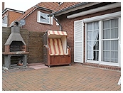 Vom Wohnesszimmer aus kommen Sie auf die große Sonnenterrasse (ca. 30 qm) mit Qualitäts-Gartenmöbeln, Strandkorb und Grill. Eine elektrische Markise beschattet bei Bedarf.