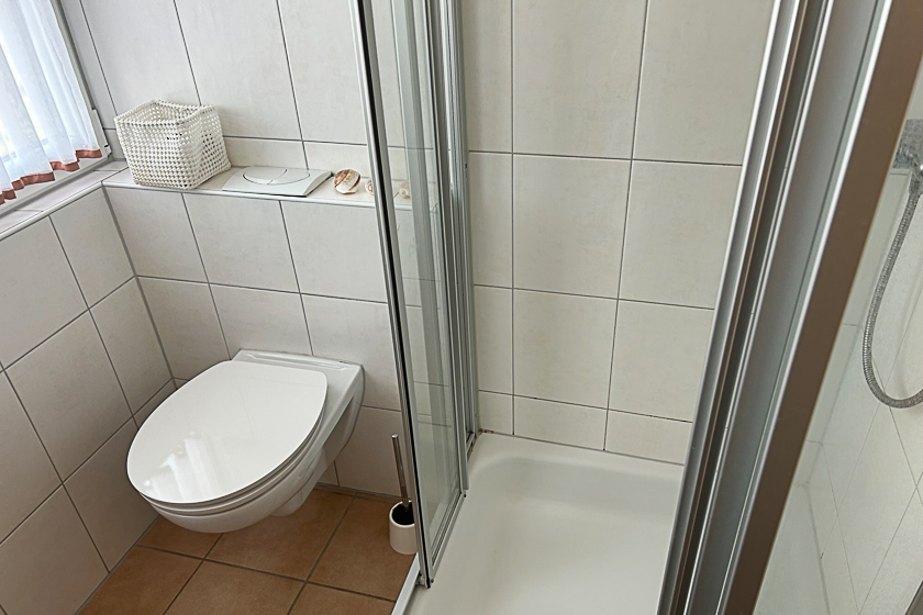 Im ersten Obergeschoss befinden sich zwei gemütliche Schlafräume und ein modernes Duschbad. Das große Schlafzimmer ist mit einem bequemen Doppelbett sowie einem zusätzlichen TV-Gerät ausgestattet, was für zusätzlichen Komfort sorgt. Das kleine Schlafzimmer ist mit zwei Einzelbetten und einem kleinen Schreibtisch eingerichtet. Die Fenster in beiden Schlafzimmern lassen sich ganz verdunkeln und sind mit Insektengitter ausgestattet.